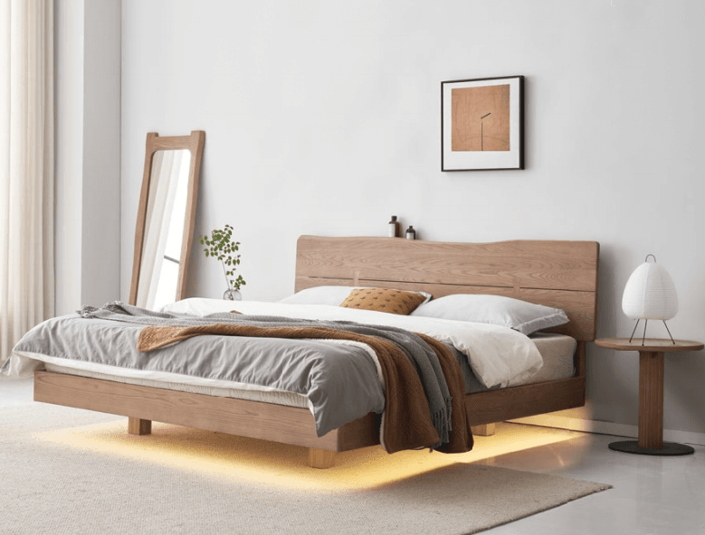 这款现代悬浮床采用优质实木打造,自然木纹饰面,床底隐藏式 LED 氛围灯营造温馨简约的卧室氛围。床架稳固、结构静音、预留扫地机器人通行空间,将现代设计与耐用实用的工艺结合,适用于全球住宅项目。
