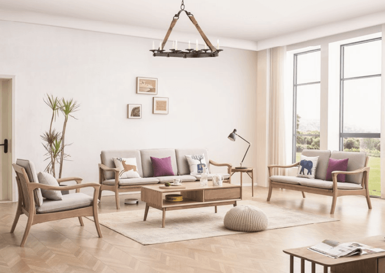 白蜡木实木沙发,流线型扶手 + 微倾靠背,原木质感,久坐更舒适。