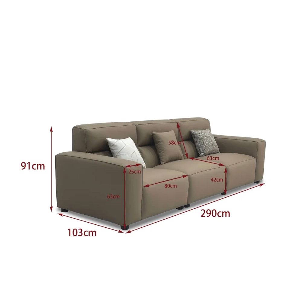 坐深:63 cm 靠背高度: 58 cm 离地高度: 42 cm 扶手宽度: 25 cm 290*103*91【生态真皮】 290*103*91【接触面牛皮】